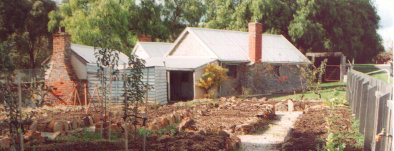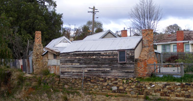 Tute's cottage, Castlemaine. This little cottage in Greenhill Avenue on the edge of Forest Creek is a great survivor of the heady days of the gold rush. This cottage was begun in 1858 under the new terms of the 'Miners Right' in the days when Forest Creek flowed naturally 100 metres or so to the north. Nowadays it teeters on the edge of the creek diversion wedged between the creek and road reserves.